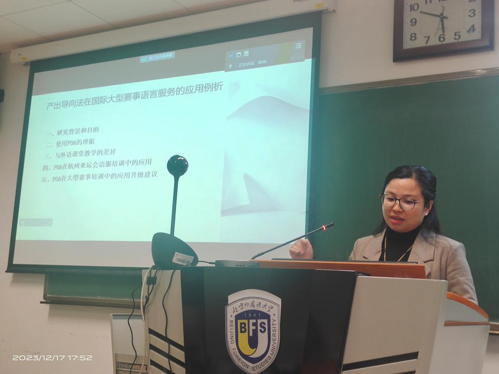 在分论坛上,高亚娟老师做了题为《产出导向法在国际大型赛事语言服务中的应用研究》的论文汇报,将云共同体两年的POA学习经验与杭州亚运会语言服务的工作经历充分结合做了语服助理培训研究,这一新颖视角受到促研员的赞赏和听众热烈的欢迎。